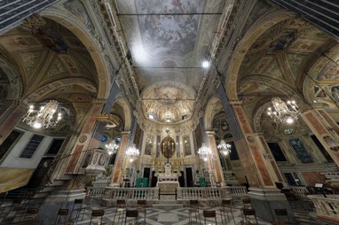 La Chiesa della Santissima Annunziata fu fondata nel 1488 dai Frati Minori Osservanti, che la dedicarono alla devozione dell’Annunciazione. Originariamente in stile tardo gotico, la chiesa subì importanti trasformazioni a partire dal 1538, quando la costruzione della nuova cinta muraria voluta dalla Repubblica genovese comportò la demolizione di parte del convento e dell’area absidale. L’aspetto che possiamo ammirare oggi è frutto della riprogettazione rinascimentale ideata da Giovan Battista Castello, tanto da meritarsi il titolo di “cantiere del Cinquecento genovese”, grazie alla presenza di numerosi maestri della pittura ligure come Luca Cambiaso.